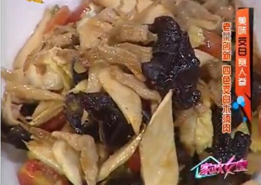 四色茭白木须肉的材料:西红柿,茭白,黄花,鸡蛋; 淀粉,葱姜,盐,味精,酱油,胡椒粉 www.caidaoke.com