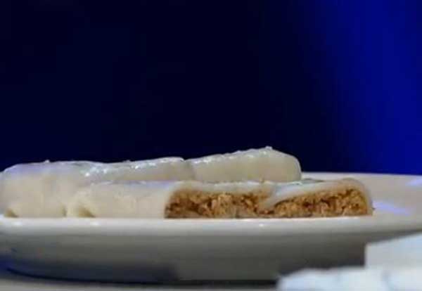 3、将饼铛烧热摊成薄饼,放在案板上,加入麻蓉折成型,下入饼铛煎一下定型即可。