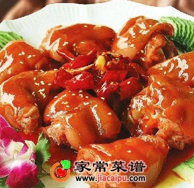 5、锅内注油烧热,下入干辣椒、花椒炒香,倒入焖猪蹄的原汁,勾芡,淋在蹄块上即成。
