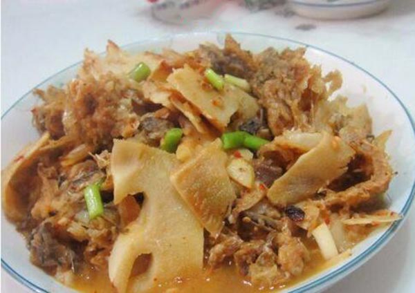 鲤鱼(去头尾)150克,植物油50克,春笋100克,料酒2克,食盐适量,味精1克,湿淀粉适量,葱、姜末各5克,胡椒粉1克,蒜3克