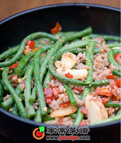 4、锅里放油,放入大蒜粒,用油煎金黄了,放入豆角炒至遍都变成虎皮后,放入剁辣椒,料酒、盐、生抽,肉馅,继续翻炒,汤汁收干后出锅。