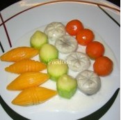 1。胡萝卜和白萝卜刮去皮,切成4厘米长的斜条,然后削成橄榄形。小白菜摘去边叶,留苞洗净。蘑菇下入开水内氽过,用冷水过凉。