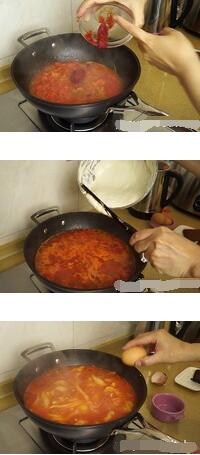 2.坐锅倒油开中火,下入葱炒出香味后加入西红柿炒软。再加入番茄膏炒匀后倒入热水。