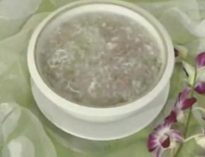 3. 中火烧热炒锅,下油,烹黄酒,加开水1500毫升、精盐、味精、胡椒粉、香油和牛肉茸,烧至微沸,用湿淀粉调稀勾芡;