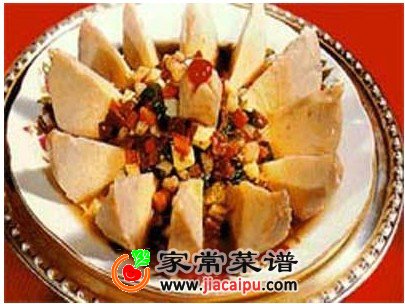 ④烧热锅,放入清汤,加火腿、鸡脯肉、海参、蛋黄糕、黄鱼肚、香菇、胡萝卜等丁料和虾米、青豆,下绍酒、盐,煮滚后加味精和葱段,用生粉水勾芡,淋入熟猪油炒匀,浇在芋艿上,中心按上一颗红樱桃即可。
