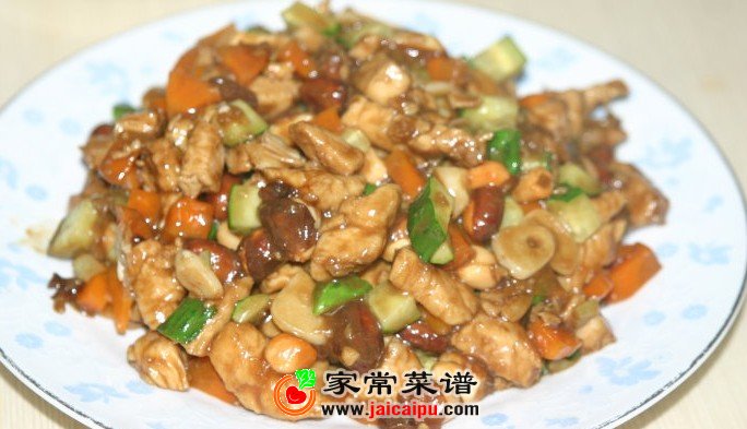 ③烧热锅,下油,烧至六成熟时,将干辣椒炒至棕红色,再下花椒,随即下拌好的鸡丁炒散,同时将姜、蒜片、葱粒下入快速炒转,加入调味汁翻炒,起锅时将炸脆的花生米放入即可。