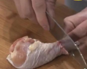 2、顺着鸡腿的跟部切上一圈,再用刀轻轻一刮,所以的肉就全出来了。这样鸡肉与鸡骨头就能很好地分离了。