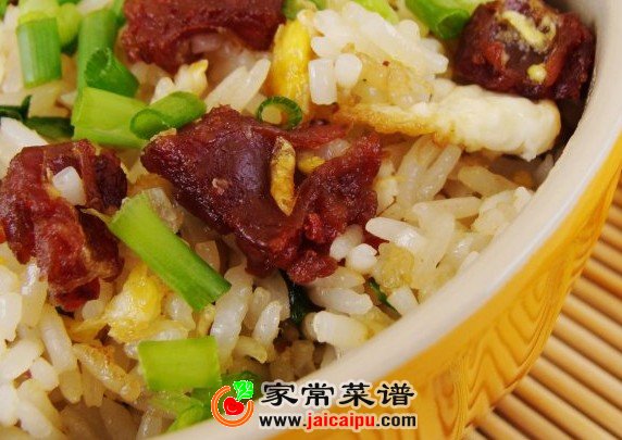 3、搅碎蛋后放腊肠去翻炒片刻。