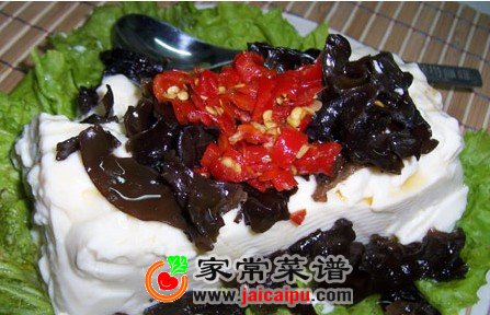 2.内脂豆腐倒扣在盘子里,洒上盐,碎木耳,剁椒,再倒点香油,即可。