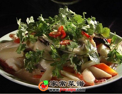 主料:加吉鱼250克。辅料:茄子(紫皮、长)50克香菜20克火腿肠100克冬笋20克芹菜50克香菇50克。 腌料:姜5克、葱10克、胡椒粉2克、盐3克、白酒5克、水1杯 调料:盐2克、白酒5克、胡椒粉