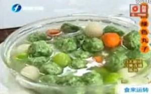 4、锅里加入适量的清水以及所有的时蔬球和丸子,入盐、白糖、胡椒粉调料,烧开后即可起锅,滴入麻油提香,相当美味的绿色丸子就做好了;