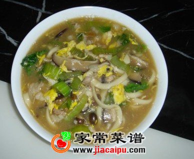 材料:香菇两大朵,松花蛋一个,大葱一小段,瘦肉丝一点点。 制作方法: 1、香菇切片,备用。 2、皮蛋拨皮,切丁;大葱切碎,备用。 3、锅内水烧开,把香菇片焯一下。 4、捞出香