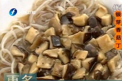 4、最后将香菇丁和芡汗一起烧到豆芽上即可。