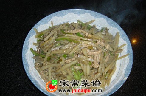 4待肉丝、藕丝快熟时,将青椒丝倒入。
