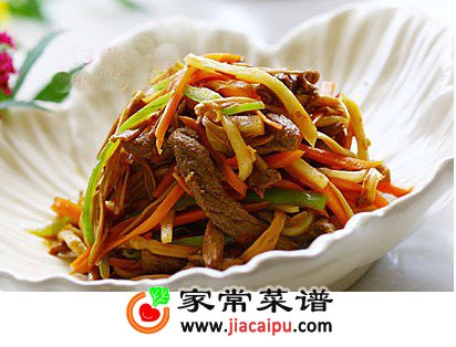 2、热锅加油,倒入牛肉丝搅散,至八成熟,捞起;倒入豆腐干丝翻炒,捞起;再倒入红辣椒丝翻炒,加豆腐干丝及糖,酱油,水,姜味,味精小炒1分钟,倒入牛肉丝翻炒,起锅前淋上生粉水5克(生粉2克加水)及麻油即可食用。