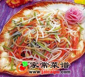 泡发蜇皮250克,绿豆芽500克,胡萝卜200克,香菜200克,盐、料酒、花生油、味精、葱花各适量。