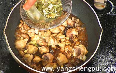 步骤2:锅中倒油,放入鸡肉煸炒,放入葱姜、料酒、酱油、生抽调味。