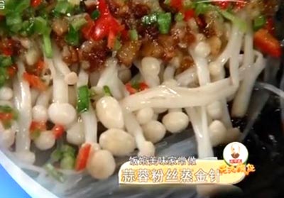 2、把切好的蒜粒下锅炸到金黄色后捞出,再把生蒜蓉、盐、糖、倒入蒜油中调均,浇在粉丝和金针菇上下锅蒸8分钟。