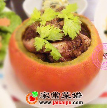 5、将蒸好的鸡取出装入南瓜盅即可。