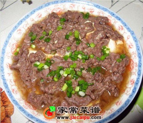 2、豆腐用刀切小片后铺在盘上,再在豆腐上面铺牛肉,蒸3-4分钟,起锅前散上葱花即可。