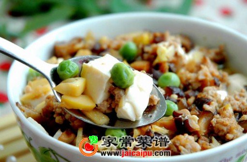 4。在豆腐上铺一层炒香的香菇笋丁肉末。