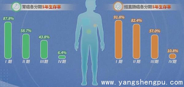 癌症治疗效果的好坏常以5年生存率做为一个参考指标。下图为胃癌与结直肠癌各分期5年生存率,从图中我们可以看到,1期的胃癌与结直肠癌的五年生存率都在90%左右。随着发病时期的增加,5年生存率依次递减。这些年由于我们国家技术的进步,癌症的治疗效果也有了显著提高,特别是四期癌症患者,过去四期的胃癌基本没有5年生存率,现在四期胃癌的5年生存率在一些医疗资源比较发达的地区,五年生存率已经超过10%,三期的胃癌5年生存率超过50%,结直肠癌更是如此。