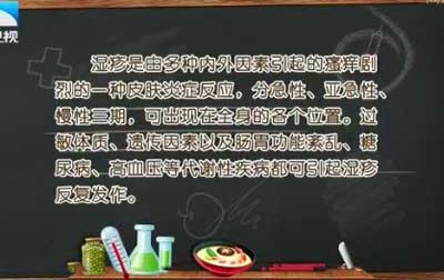 湿疹的治疗方法。以下内容主北京卫视养生堂20130802期节目视频及笔记,本期节目的主题是《皮肤发出的求救信号-3》。主要介绍:湿疹治疗方法、脾胃不和、湿热内蕴、健脾利