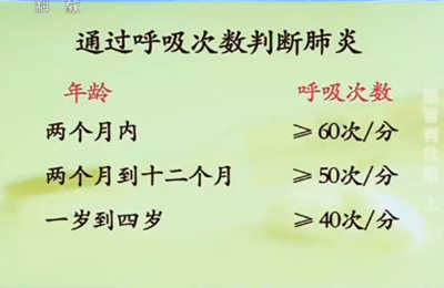 专家介绍:小儿呼吸增快时是肺炎的典型表现,因为孩子的管腔结构很窄,当他有炎症时会变得更窄,所以得肺炎时会出现呼吸增快的现象。下图为通过孩子呼吸次数判断孩子肺炎的方法。可以用棉絮入在孩子鼻孔处数呼吸次数。