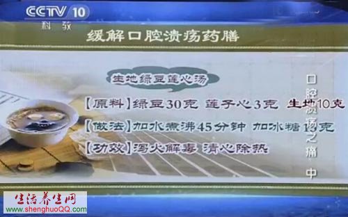 中医讲:“舌为心之苗”,所以长在舌头尖上的口腔溃疡一般都是由于心火引起的。专家介绍,莲子芯有清心去火、宁心安神的作用,用6~10根(一天的量)水喝可以缓解心火引起的口腔溃疡。还可以使用成药“牛黄清心丸”,一次吃一粒,一天三次。