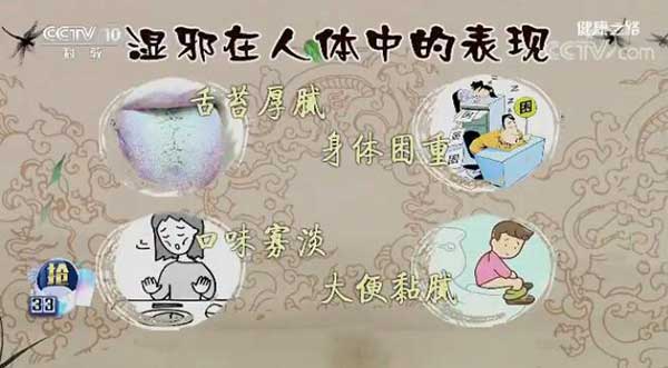 湿邪在人体中的表现:舌苔厚腻;口味寡淡,胃品不好;身体困重,走路的时候脚像灌了铅一样;大便黏腻,大便挂马桶,冲不干净。
