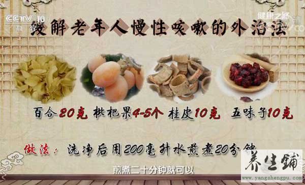 老年人慢性咳嗽、尿失禁多与肾虚有关。使用百合和枇杷果、桂皮、五味子制成药液。采用玻璃容器进行熏法治疗,将药液加温以后将水蒸气直接吸入到肺里,达到治疗的作用,每天两次可以缓解咳嗽的症状。