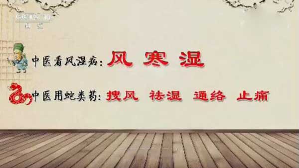 中医将风湿类疾病又称痹症,中医认为风、寒、湿三气杂至,合而为痹。蛇类药具有很强的搜风、祛湿、通络、止痛的功效,服用蛇类药泡的药酒可以起到缓解风湿疾病的作用。