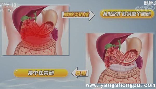 胃部引起疼痛集中于胃部,疼痛是间歇性疼痛,不剧烈,可缓解。胰腺炎疼痛从肚脐上方向整个腹部扩散,整个腹部都感觉到疼痛,疼痛剧烈且不会缓解。