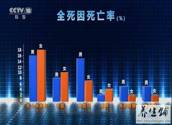 2009年美国一个权威的运动医学研究团队公布的结果显示:不管男女,低心肺耐力所引起的全死因死亡率都是最高的。