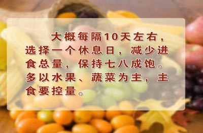 定期让肠道得到休息。每10天左右选一个休息日,以蔬菜水果为主吃七八成饱,这样能让肠道得到休息,也有利于清空肠道内的食物残渣,但如果您血糖不稳定,则不要使用此方法。