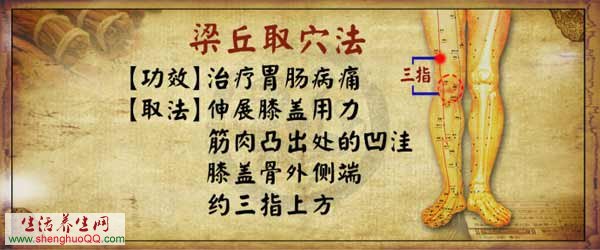 梁丘位于足阳明胃经,胃经主治肠胃等消化系统、神经系统、呼吸系统、循环系统某些病症和咽喉、头面、口、牙、鼻等器官病症,以及本经脉所经过部位的病症。梁丘穴有调理脾胃之效,为治疗胃肠病痛的名穴;主治急性胃痛、乳痈、尿血、膝肿痛、下肢不遂等病症,和胃止痛。