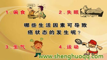 现代研究显示,许多癌症与饮食失调有密切关系。饮食在癌的病因中占30%-35%;美国斯坦福大学医学研究中心的科学家们研究证明,正确的睡眠方式能够预防机体组织遭到癌症的侵袭;不良的情绪是癌症的“活化剂”,不良情绪常常是癌症发生的“前奏”;过度的运动与过度的安逸,均可成为致病因 素而引起疾病。