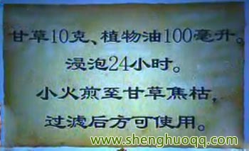 如果你想用外擦的方法,大家可千万不能用激素类的药膏。脸上擦多了激素类的药有可能变成一块色素的沉着或者局部皮肤变粗糙、毛孔变大、寒毛变重等一系列的 症状。养生堂给我们推荐了一种自己可以制作的药叫“甘草油”,制作方法:买一两生甘草、二两植物油,将它们搁在一小碗里泡上24小时;第二天把它放到锅里 煎煎到甘草枯焦但是不糊的状态,把甘草捞出来,把油装入一个小瓶;每天给孩子擦上一点就行了。