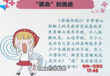 以下内容为湖北卫视饮食养生汇20141027期节目视频及要点内容,本期养生主题《痣出有因》。养生讲述专家:武汉协和医院皮肤科主任——陶娟。主持人:刘仪伟。