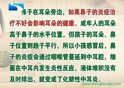 鼻子在耳朵旁边,如果鼻子的炎症治疗不好会影响耳朵的健康。成年人的耳朵高于鼻子的水平位置,但孩子的耳朵、鼻子位置则趋于平行,所以小孩感冒后,鼻子的炎症会通过咽喉管蔓延到中耳腔,细菌在中耳中发生炎性反应,液体堆积没有及时排出,就变成了化脓必中耳炎。