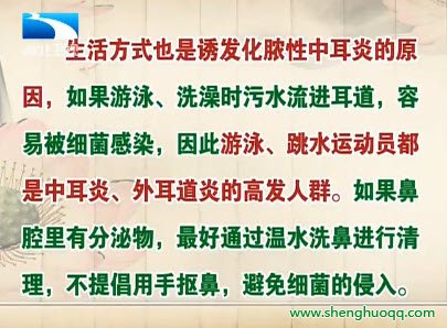 生活方式也是诱发化脓性中耳炎的原因,如果游泳、洗澡时污水流进耳道,容易被细菌感染,因此游泳、跳水运动员都是中耳炎、外耳道炎的高发人群。如果鼻腔里有分泌物,最好通过温水洗鼻进行清理,不提倡用手抠鼻,避免细菌的侵入。