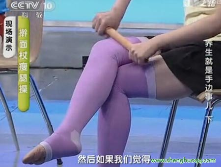 3、翘起二郎腿,用左腿的膝盖抵住右腿的腘窝处,正向握住擀面杖,用擀面杖的中部从外踝逐渐向上滚动。擀的过程中要避开骨头隆起的地方,尽量擀在肉厚的地方。同时在擀的过程中我们可以加强某个局部的刺激,如:腿部的丰隆穴(位于小腿外侧中间的位置)。