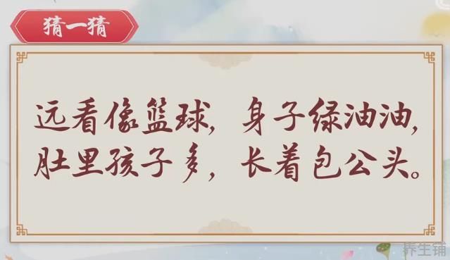【猜一猜】远看像篮球,身子绿油油,肚里孩子多,长着包公头。