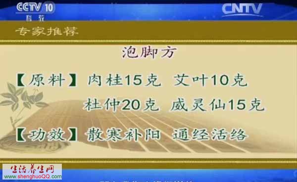 【原料】生姜15克、红花12克、桂枝15克。 【制法】水煎泡脚。 【功效】发汗解肌、温经通络。 【出处】 健康之路20160304钱会南:病从寒中来(四) 老寒腿泡脚方