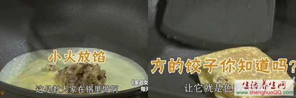 2、馅炒好后取出,擦干锅,下入少量油抹均,下入打好的鸡蛋,表现铺上馅,四边卷起略煎一下即可。用此方法做出多个蛋饺。
