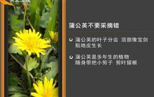 区分蒲公英不能单靠小黄花来区分,蒲公英的叶子分齿,顶部像宝剑,贴着地皮生长;蒲公英是多年生草本植物,采摘是用剪子取叶留根即可,来年还可以采摘。