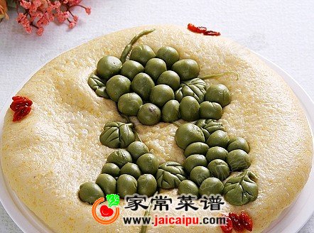 10、再把做好的葡萄粒底部刷清水,放置到玉米饼上,摆成3串葡萄的样子。