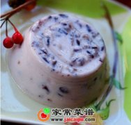 材料: 椰浆、牛奶、紫米、鱼胶粉、糖粉、粟粉少许; 做法: 1、紫米清洗干净,用水泡一个小时; 2、加三倍的水,煮至软糯; 3、煮好的紫米捞出,放凉; 4、椰浆、牛奶、糖粉、少...