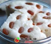 原料:粘米粉100g,泡打粉3g,糖35g,水130ml,葡萄干10g 制作方法: 1、糖水煮融,放凉。 2、粘米粉+泡打粉,过筛3次,+糖水,拌匀。 3、烤模抹油,米糊入模。 4、旺火蒸10min,顶上开花...