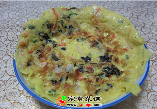 2。三丝入油锅翻炒,炒出香味后,加少许盐,倒入搅拌好的鸡蛋面糊,小火慢烙,两面反复烙,熟后就可以出锅了。